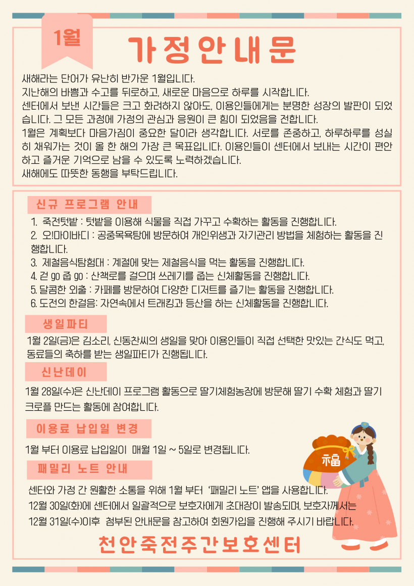 2026년 1월 가정안내문 페이지 정보 작성자 김미리 작성일26-01-05 14:44 조회180회 댓글0건 이전글 다음글 목록 본문 2026년 1월 가정안내문 입니다. 댓글목록 등록된 댓글이 없습니다. 이전글 다음글 목록