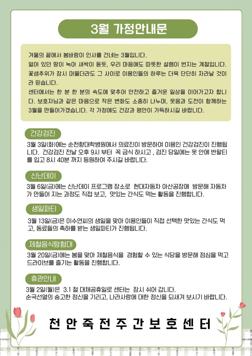 2026년 3월 가정안내문 페이지 정보 작성자 김미리 작성일26-02-26 08:22 조회188회 댓글0건 다음글 목록 본문 3월 가정안내문입니다. 댓글목록 등록된 댓글이 없습니다. 다음글 목록