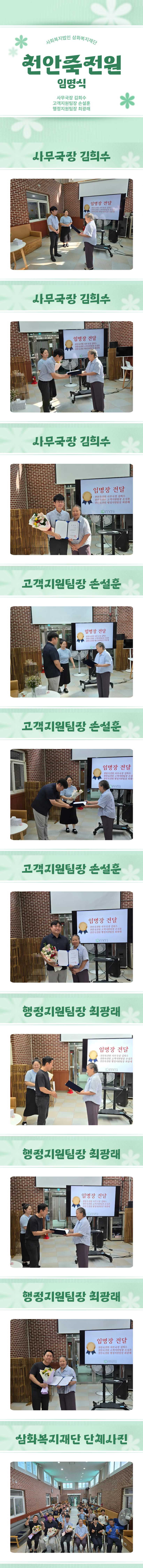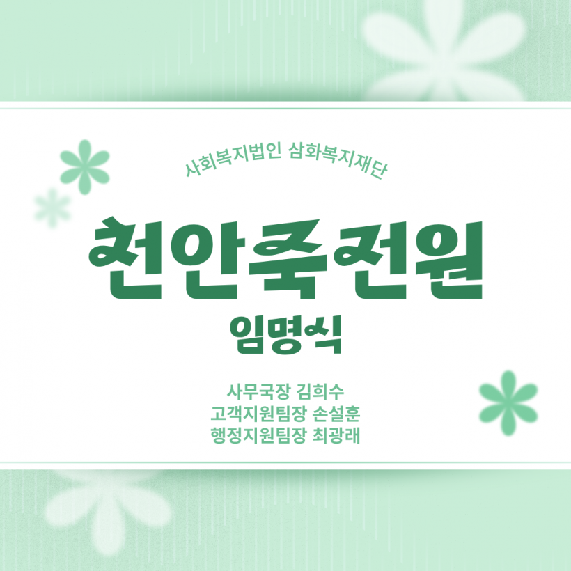 [9월] 사무국장 · 팀장 임명식 페이지 정보 작성자 운영자 작성일25-10-15 17:08 조회25회 댓글0건 관련링크 목록 본문 2025년 09월 01일(월) 김희수 사무국장님, 손설훈 고객지원팀장님, 최광래 행정지원팀장님 임명식을 진행하였습니다.천안죽전원 직원분들과 가족분들께서 뜨거운 박수와 힘찬 응원을 해주셨습니다. 댓글목록 등록된 댓글이 없습니다. 목록