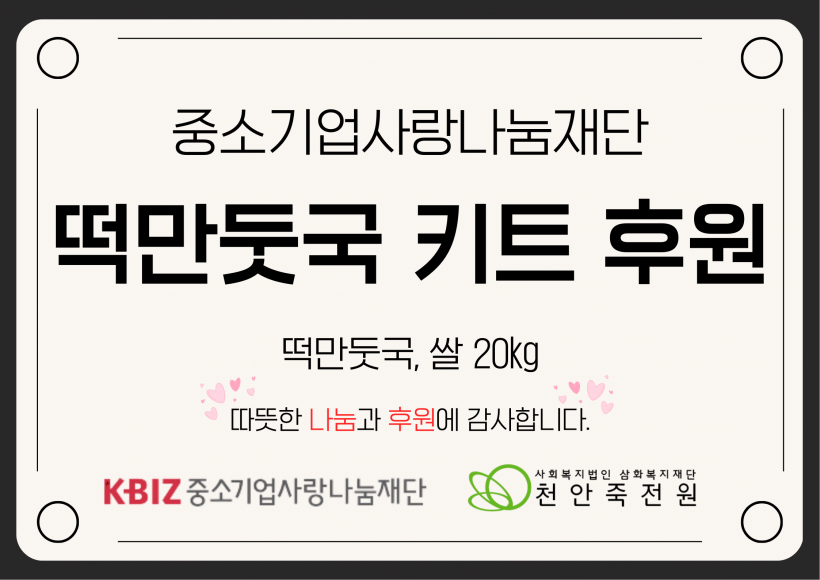 중소기업사랑나눔재단 떡만둣국키트, 쌀 후원 페이지 정보 작성자 운영자 작성일26-02-05 13:45 조회168회 댓글0건 관련링크 목록 본문 26.01.28.(수)중소기업사랑나눔재단 떡만둣국키트, 쌀 후원해주셨습니다.가족분들도 환하게 웃으시면서 맛있게 식사 하셨습니다.천안죽전원에게 사랑과 나눔을 해주신 중소기업사랑나눔재단에게 다시한번 감사의 말씀을 드립니다.감사합니다. 댓글목록 등록된 댓글이 없습니다. 목록