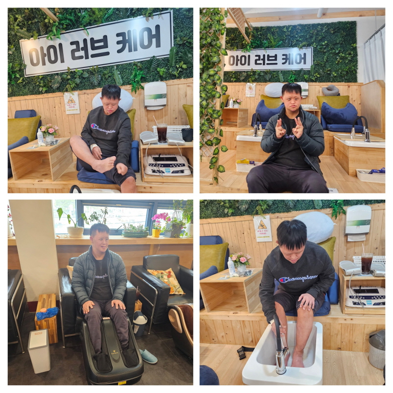 카페에 도착해 족욕통에 발을 담그는 순간, 따끈한 온기가 발끝부터 퍼지며 자연스럽게 표정도 한결 편안해졌고, 사진으로 표현된 메뉴판을 보고 김** 이용인이 직접 원하는 음료를 고르는 과정도 작은 즐거움이 되었습니다.